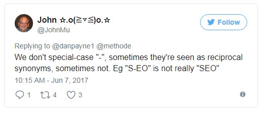 Дело в том, что Google считает запросы с дефисами иногда синонимами, а иногда нет. Как именно поисковая система принимает решение о синонимах, Джон Мюллер не пояснил.