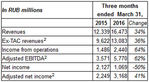 Опубликованы неаудированные финансовые результаты компании Яндекс за I квартал 2016 года. Компания увеличила консолидированную выручку на 34% по сравнению с тем же периодом прошлого года. Таким образом, выручка компании составила 16,5 млрд. рублей (или 243,7 млн. долларов США).