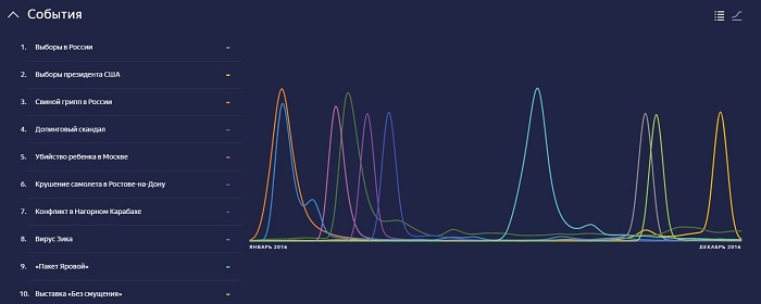 Наиболее интересными событиями для россиян стали: выборы в России, выборы президента США, «Пакет Яровой», допинговый скандал и свиной грипп. Персоны, которыми больше всего интересовались жители нашей страны: Дональд Трамп и его жена Мелания Трамп, Леонардо Ди Каприо, Алан Рикман, Дэвид Боуи, Ксения Собчак и Ольга Бузова. Среди фильмов и сериалов, как российских, так и зарубежных, больше всего запросов было связано с «Отряд Самоубийц», «Дэдпул», «Игра престолов», «Ходячие мертвецы», «Физрук» и «Молодежка». Среди спортивных событий особый интерес, конечно же, вызвали Олимпиада в Рио-де-Жанейро и Евро-2016.