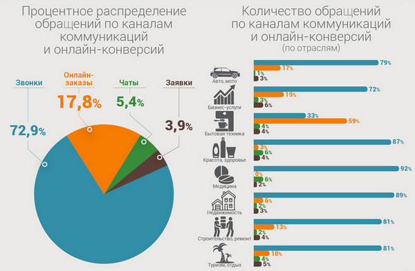 Около тысячи компаний было опрошено сервисом сквозной аналитики CoMagic с целью исследования и сбора статистики по показателям конверсии различных каналов коммуникаций на сайте в обращения. Согласно полученным данным, 73% потенциальных клиентов предпочитают звонки.