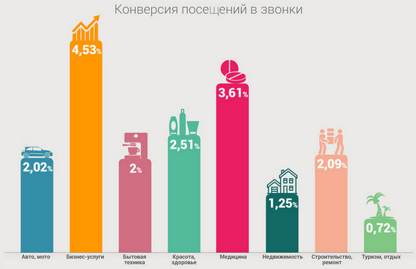 Компанией CoMagic были опрошены различные корпоративные порталы, интернет-магазины и промо-сайты. Звонки и заказы онлайн – наиболее предпочтительные каналы коммуникаций, как выяснили в сервисе аналитики. Также выяснилось, что в среднем в звонки конвертируется 2,3% от общего объема входящего трафика на сайт. Причем 5,5% таких звонков по разным причинам теряется. В CoMagic определили, что самый высокий показатель конверсии звонков в медицинской тематике и бизнес-услугах (3,61% и 4,53% соответственно).