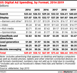Согласно прогнозам eMarketer, в этом году медийная реклама заработает $32,17 млрд. На долю контекстной рекламы придется $29,24 млрд. Рост оборотов медийки произойдет за счет нативной рекламы в социальных сетях ($13,39 млрд), видеорекламы ($9,59 млрд) и объявлений формата rich media, а также спонсированных публикаций брендов. При этом расходы на десктопную поисковую рекламу продолжат сокращаться. В этом году они составят $10,70 млрд против $12,91 в 2015. А вот затраты на мобильный поиск увеличатся, что вполне логично, учитывая последние тренды.