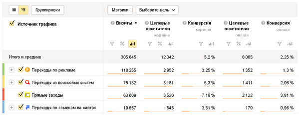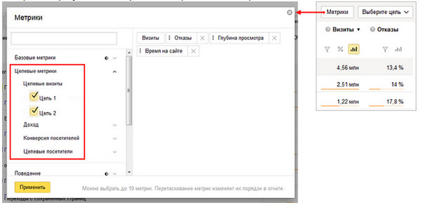 Сервис Яндекс.Метрика запустил новый инструмент для анализа конверсий - «Целевые метрики». Он дает возможность получения в любом отчете подробных данных сразу по нескольким целям, одновременно с любыми другими метриками. Нужные цели и параметры выбираются в меню «Метрики»: