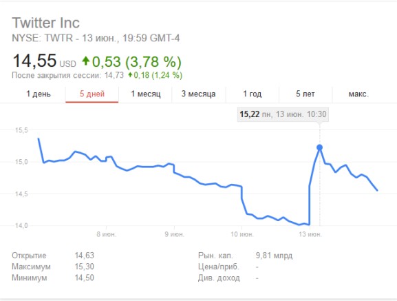 Оглашение данной информации сказалось, как ни странно, на стоимости акций другой социальной сети – Twitter. Во время торгов, которые велись в течение 13 июня, стоимость акций компании поднималась на 9,1%, достигнув в конце дня $14,55 за ценную бумагу.