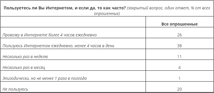 45% россиян, достигших совершеннолетия, заходят хотя бы в одну социальную сеть хотя бы раз в день. 62% опрошенных – еженедельно. 10% респондентов не завели все еще аккаунты ни в одной из социальных сетей. А 20% россиян не имеют доступа к интернету, поэтому также исключены из рядов пользователей социальных сетей и мессенджеров. При этом относительно большой процент (15%) опрошенных старше 60-ти лет используют социальные сети. Вполне ожидаемо, что наиболее активными пользователями социальных медиа являются молодые люди возрастом от 18 до 24 лет. Ежедневно 91% респондентов этой возрастной группы посещают соцсети.