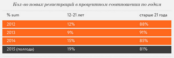 Например, вопреки всеобщему заблуждению, что «Одноклассниками» в основном пользуются люди старше сорока лет, статистика говорит несколько иное. Так, в первом полугодии 2015 в социальной сети зарегистрировалось 19% младше 21 года. На пользователей старше 21 года приходится 81% зарегистрировавшихся в первые шесть месяцев этого года. Стоит отметить, здесь не указано распределение пользователей по возрасту. И какое количество пользователей от 21 до 31 года, например, остается не ясным. Но все же порадуемся, что наконец-то аудитория «Одноклассников» стала молодеть!