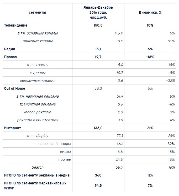 Комиссия экспертов Ассоциации коммуникационных агентств России (АКАР) подвела итоги развития рекламной индустрии в России за 2016 год. Суммарный объем рекламы по сравнению с 2015 годом вырос на 11% и составил 360 млрд. рублей за вычетом НДС.