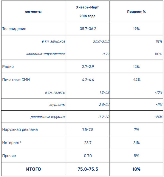 В целом рынок рекламы в России в первом квартале 2016 года составил 75 млрд рублей, показав рост на 18% по сравнению с прошлым годом. На первом месте по объему доходов в России все еще остается реклама на телевидении (36 млрд рублей). А вот сегмент рекламы в печатных СМИ неуклонно падает. За отчетный период показатели по данному рынку снизились на 14%. Стоит отметить, что в отчете АКАР по рынку интернет-рекламы в этот раз объединены данные по контексту и медийке.