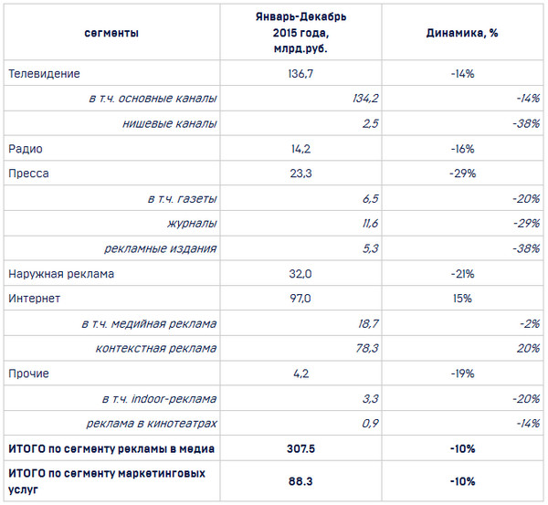 При этом общий объем рекламного рынка показал падение на 10% по сравнению с 2014 годом. Таким образом, рынок рекламы в нашей стране в 2015 году составил 307,5 млрд рублей. Отрицательную динамику продемонстрировали печатные СМИ (-29%) и наружная реклама (-21%). А вот телевидение снова оказалось наиболее востребованным сегментом у рекламодателей. На ТВ-рекламу в 2015 году было потрачено 136,7 млрд рублей.