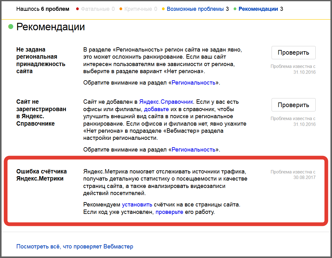 В сервисе Яндекс.Вебмастер добавлена новая функция, позволяющая получить информацию о неработающем счетчике Яндекс.Метрика. Об этом сообщается в блоге Яндекса для вебмастеров.