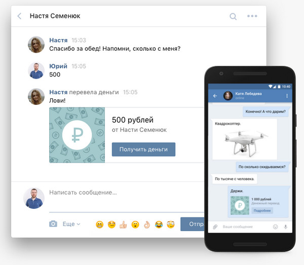 У пользователей социальной сети ВКонтакте появилась возможность совершать денежные переводы прямо в сообщениях, используя банковскую карту. Пока нововведение доступно с карт MasterCard, Visa и Maestro, для всех в веб-версии сайта и для пользователей смартфонов на операционных системах Android и Windows Phone.