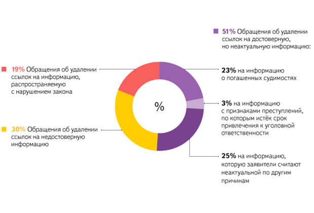 Компания «Яндекс» опубликовала в своем корпоративном блоге статистику по заявлениям пользователей по закону о «праве на забвение». Данный закон, вступивший в силу 1 января 2016 года, обязывает поисковые системы по заявлению гражданина и без решения суда удалять из результатов поиска ссылки на незаконную, недостоверную или неактуальную информацию о заявителе.
