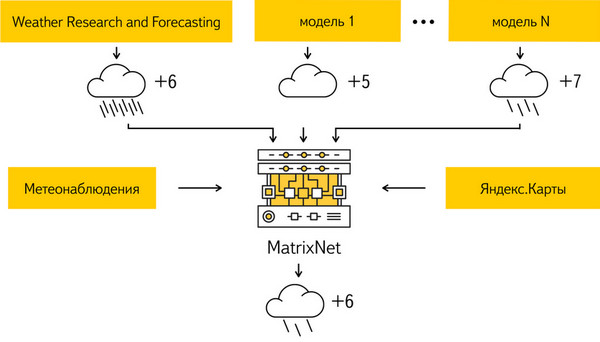 Уникальная технология Метеум позволяет предсказывать погодные условия с точностью до дома на основании машинного обучения. Система Матрикснет принимает на вход специальным образом переработанные архивы прогнозов погоды и сопоставляет их с данными о реальной метеорологической обстановке. В качестве данных о реальной погоде используются наблюдения, полученные на тысячах профессиональных метеостанций по всему миру. Полученные данные сопоставляются, и получается формула корректировки прогноза.